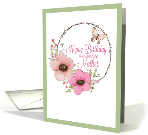 A birthday card with pink flowers, tiny berries, and leaves are depicted on this cheerful greeting to wish a special Mother a happy birthday. A butterfly sits charmingly in the top corner. A soft muted green border edges the card to accent the illustrated wreath in the center.