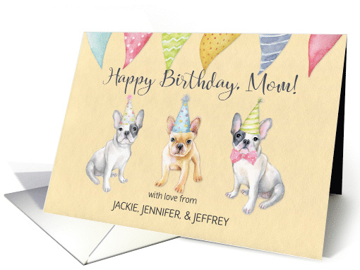 Artist Notes: Cute birthday card for a mother who has three children, or from husband and two children, or for a mother who simply likes dogs! The card front has three bulldogs wearing party hats and can be personalized with the family names. Card designed by Simply Put by Robin; elements from The Hungry Jpeg