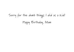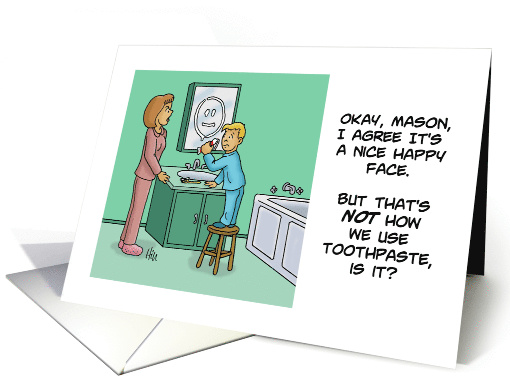 Humorous Birthday card for mom from a son. The front shows a cartoon of a mother talking to her son who has used the toothpaste to draw a happy face on the bathroom mirror. She says: Okay, Mason, I agree it's a nice happy face. But that's not how we use toothpaste! Inside says: Sorry for the dumb things I did as a kid! Happy Birthday, Mom