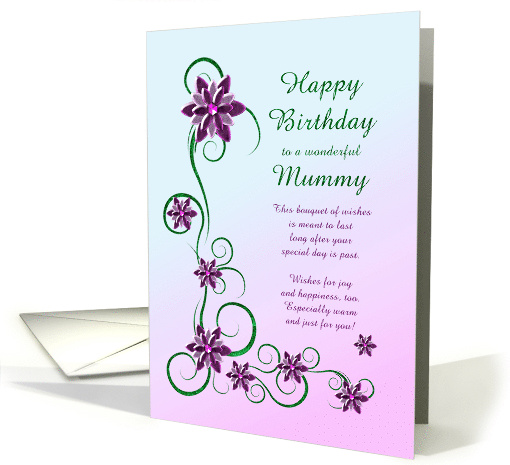 An elegant and beautiful birthday card. A perfect card to give to your mummy. Purple flowers and glittery scrolls make a very special birthday card.