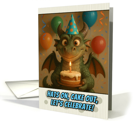 This birthday card features a whimsical, digitally illustrated cartoon of an European Dragon wearing a colorful party hat. In the front is a birthday cake with a lit birthday candle. The background shows a festive party scene with colorful balloons, along with streamers and confetti. The card has a creamy, striped border at the top and bottom, framing the colorful celebration scene. At the bottom of the card is a bold, blue text that reads: "HATS ON, CAKE OUT, LET'S CELEBRATE!" The text has a playful, energetic style typical of greeting cards. The overall design combines cute animal imagery with bright party elements to create a cheerful, whimsical birthday greeting.