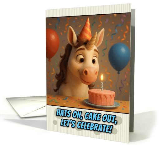 This birthday card features a whimsical, digitally illustrated cartoon of a Unicorn wearing a colorful party hat. In the front is a birthday cake with a lit birthday candle. The background shows a festive party scene with colorful balloons, along with streamers and confetti. The card has a creamy, striped border at the top and bottom, framing the colorful celebration scene. At the bottom of the card is a bold, blue text that reads: "HATS ON, CAKE OUT, LET'S CELEBRATE!" The text has a playful, energetic style typical of greeting cards. The overall design combines cute animal imagery with bright party elements to create a cheerful, whimsical birthday greeting.