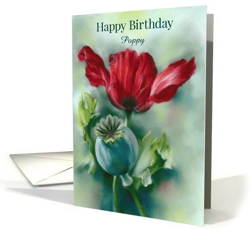 | Artist Notes: | Easily personalize this birthday greeting with any name. The design is embellished with a delicate poppy blossom in rich red shades accented by green leaves and a round seed pod. |