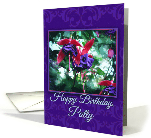 | Artist Notes: | Two purple and red fuschias dance across this card wishing a Happy Birthday to Patty. You may upload your own photo to the inside cover and may also change the inside text if you wish. |