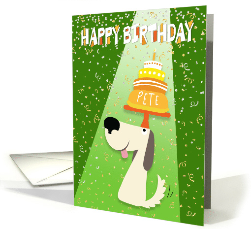 | Title: | Pete Birthday Card - Dog Balancing Birthday Cake on Head |