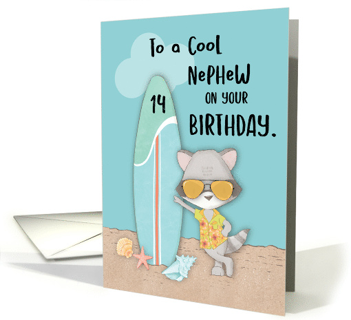 | Artist Notes: | This cool raccoon seems to be inviting you nephew to ride the waves with him. And since your nephew is such a beach bum himself, he will surely jump in and join this cute raccoon. But first you should buy this card to greet him a happy 14th birthday. |