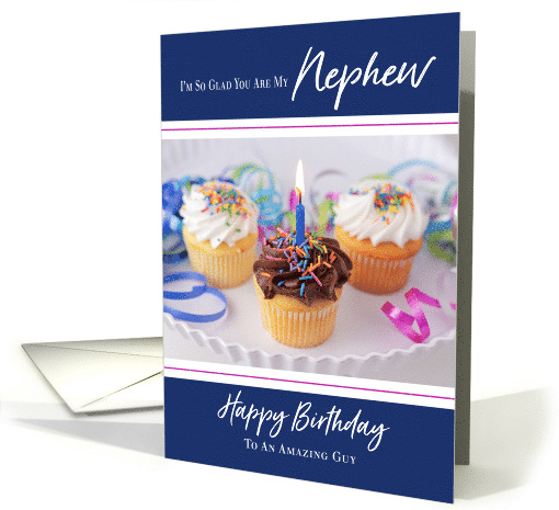 Wish your special nephew a happy birthday with these cheerful cupcakes decorated with colorful sprinkles, a shining candle and surrounded by curly ribbon.