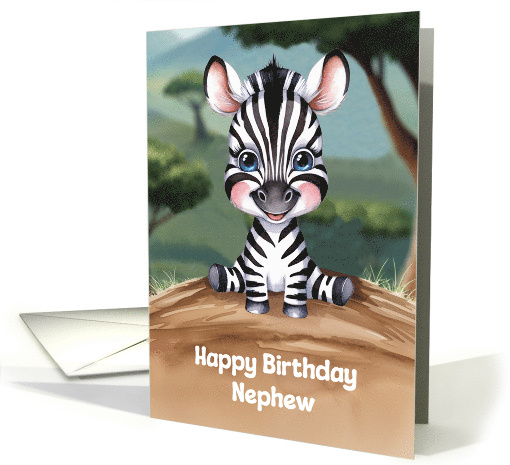 Celebrate a special milestone with this adorable birthday card for a little boy. The card features a sweet and cheerful watercolor-style illustration of a baby zebra with bright blue eyes, rosy cheeks, and a joyful smile. The zebra is perched on a soft earthy background of a savanna landscape with lush greenery and soft hills in the distance, adding warmth and charm to the design. The text, “Happy Birthday Nephew,” is written in a playful white font, perfectly complementing the delightful artwork. This card is ideal for expressing love and joy on your loved ones birthday, capturing the innocence and excitement of this special occasion.