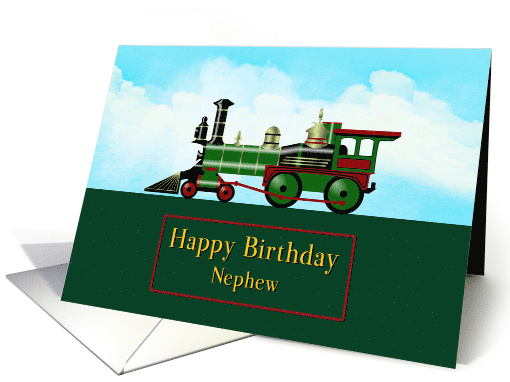 Say Happy Birthday to your nephew with a colorful image of a cow catcher steam engine. The steam engine is sitting on a dark green block with a beautiful blue and white clouds in the background. The text is "Happy Birthday Nephew".