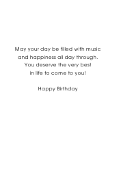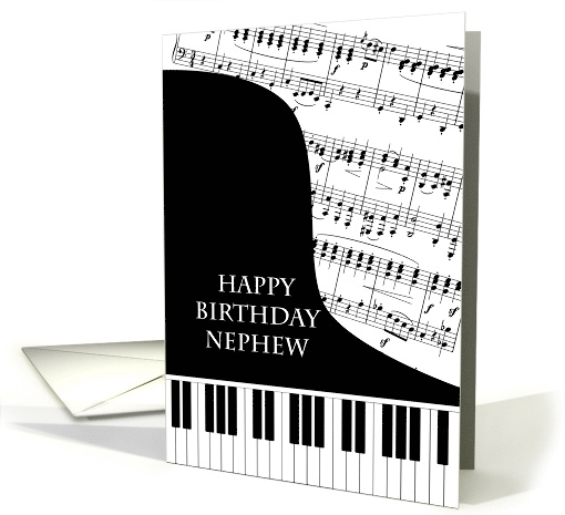 A birthday card for a nephew who is into piano music. A grand piano with the keys along the bottom of the card. A sheet of music fills the background. A great card for somone who loves music. This is NOT a musical card, it does NOT play music: