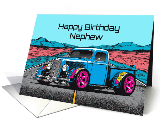 Make your nephew’s birthday extra special with this eye-catching automotive-inspired greeting card! A beautifully rendered blue vintage pickup truck captures attention with its sleek lines and polished chrome grille. The hot pink rims and bold geometric fender accents give the design a playful, modern edge rooted in pop-art creativity. Set against a vibrant desert highway scene—with deep red sands and cool blue mountain peaks—this card symbolizes excitement, adventure, and a bold year ahead. Designed in a crisp, high-contrast digital style, it’s a perfect birthday card for a nephew who appreciates classic style with a unique artistic twist!