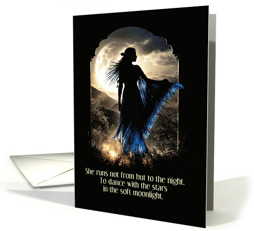 A bohemian birthday card with a beautiful silhouette women and moon and a poem for the wild and free spirited one.