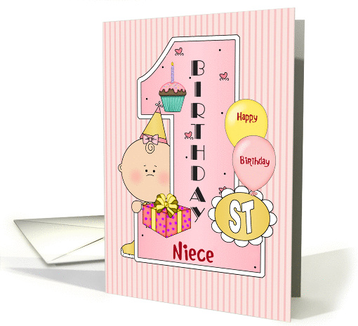 A perfectly pink 1st birthday card for Niece's birthday, featuring a large number "1" with a baby girl peeking out the side, a pink balloon and a yellow balloon, with the words Birthday in black down the center and "Niece" along the bottom. Large Number 1 with baby created by Alice Smith at DollarGraphicsDepot.