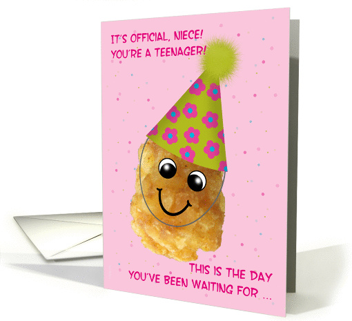 Celebrate your teenage niece with this funny card that features a tater tot wearing a birthday party hat. A cute photo of an actual fried potato nugget, surrounded by confetti! Fun for the 13 year old girl who loves pink. Original photo, art and verse © Penny Cork.