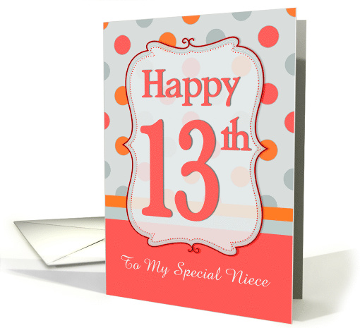 Bright and cheerful red, orange and gray polka dots are featured on fun, trendy 13th birthday card for niece. Personalize with her name to make it extra special. Original design by Anura Design Studio.