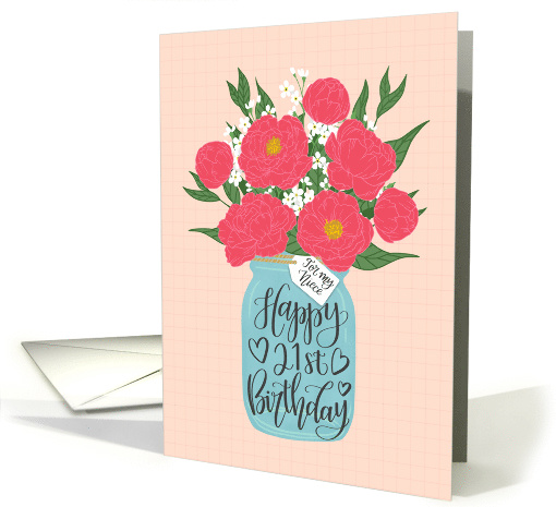 A mason jar filled with a gorgeous bunch of peonies with the hand lettered words 'For my niece' on the tag and 'Happy 21st Birthday' on the mason jar. The perfect birthday card for your niece turning the big 2-1.
