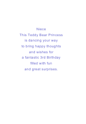 A cute purple teddy bear princess dressed in a lovely yellow jeweled crown and pink, blue and green flowers dancing on the Birthday B and holding a bunch of balloons with the word HAPPY on them will bring a smile to your niece on her 3rd birthday. Text may be personalized with name.