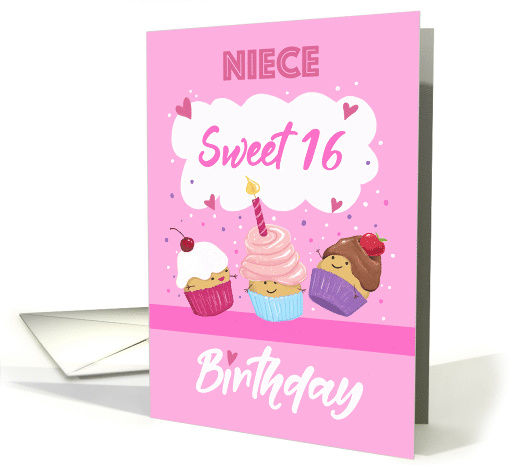 Niece Sweet 16th Birthday card design illustrated with 3 cute cupcakes, set on a pink background. ©DaleSimpson