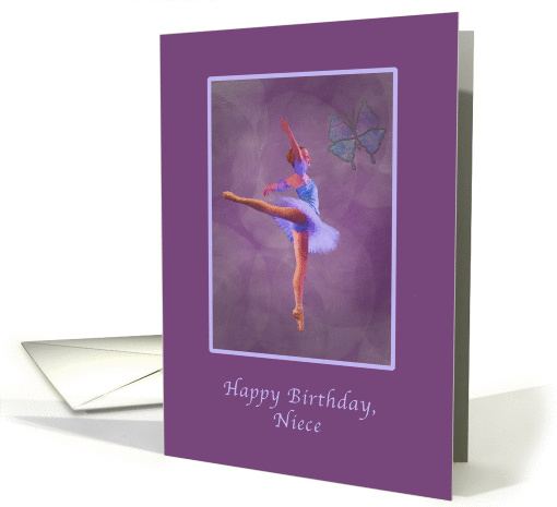 A little ballerina in a colorful costume of blue and light purple strikes an arabesque position on this birthday card for a niece. The background is various muted shades of purple and the card has a wide purple border. A colorful butterfly hovers in the top right of the image. The butterfly is a modified version of one from Pat’s Flora and Fauna and the background is from Karen’s Scraps and Graphics, both of Digital Scrap Designs.
