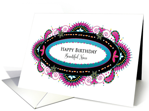 Unique oval design with a flare of native Indian decorative patterns in fuchsia, black, blues, and yellow. Other Categories are available.