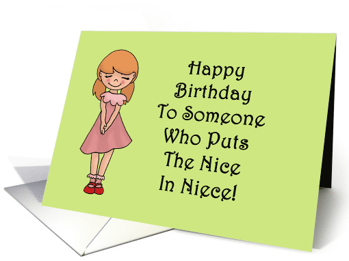 Cute Niece Birthday Card with a cartoon cute girl on a green background. The words say: Happy birthday to someone who puts the nice in niece! Inside says: Enjoy your special day!