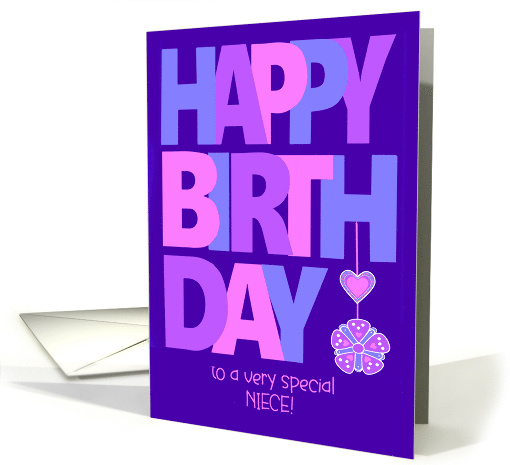 A pretty but bold Birthday Card for your niece. The front cover greeting, on a dark blue background, is 'HAPPY BIRTHDAY' in very large capital letters in pastel shades of pink, mauve and blue, split into three lines, with a decorative heart and a flower hanging from the 'H' at the end of 'BIRTH' in the space after, 'DAY'. The wording below in a much smaller, informal font, is 'to a very special NIECE!' The inside message is just a suggestion and you can easily edit it or delete it altogether, if you wish.