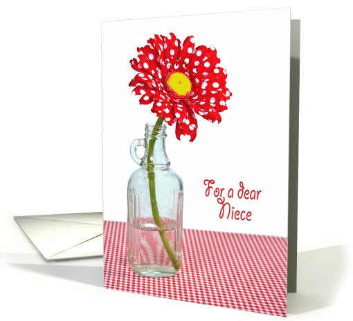 Red and white polka dot daisy in a vintage bottle on checkered paper for Niece's birthday.