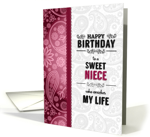 Special birthday wishes in sweet pink and silver tones, and an old-fashioned look, this paisley themed birthday card is sure to make your niece smile.