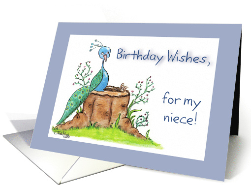 ©Christie Black. A lovely drawing of a cartoon peacock sits on a stump in this birthday wish for niece.