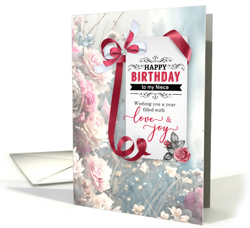 When you add your niece's name to the front of this card, you create a personalized birthday greeting she's sure to love. Pink and black vintage rose print in the background with ribbon and bow accents to pair up with a fun message of growing old with grace.