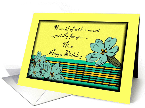 Pretty Primrose flowers makes a beautiful Birthday Card for your Niece. The card has primrose flowers on a pastel blue and yellow diamond background. With Text on the front cover.