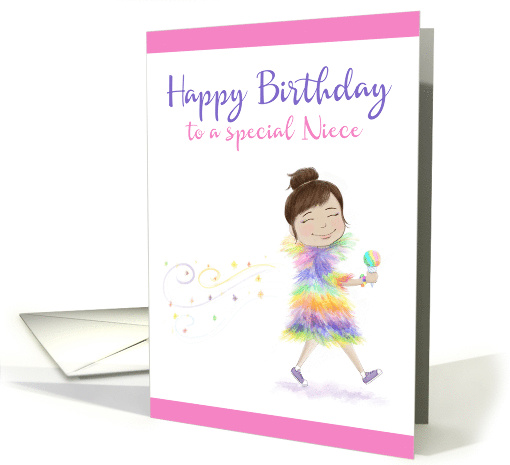 Happy Birthday Niece, Girl with Sparkles and Rainbow Outfit