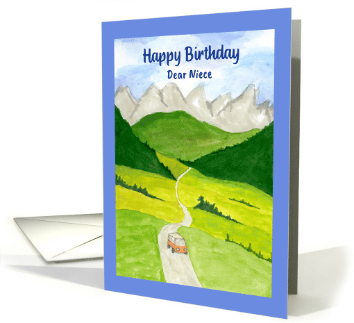 A beautiful country road trip scene—a small car traveling along a picturesque route surrounded by rolling green fields and tall mountains—is included on this happy and colorful birthday card for your adorable Niece.