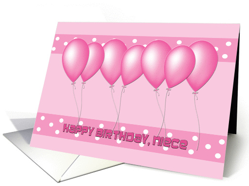 Sweet, pink balloons on a pink background with white polka dots are featured on this birthday greeting card for a niece.