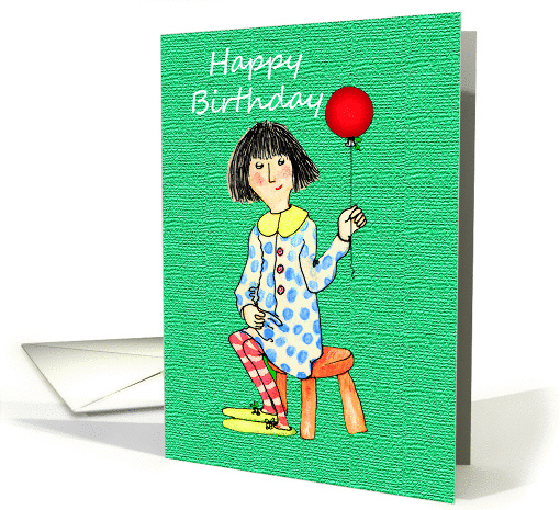 A little girl sitting on a stool wearing red and white stripy stockings and a blue spotty dress with a yellow collar, and holding a red balloon.Happy Birthday is written in white on a green background.