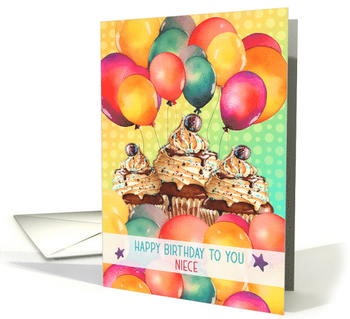 Give your niece bright, colorful, and delicious looking happy birthday greetings with this vibrant design featuring a bunch of balloons surrounding three yummy looking chocolate cupcakes.