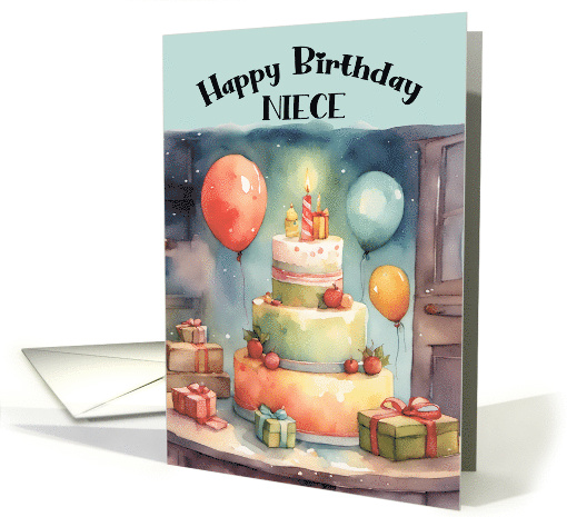 A brightly watercolor painted card shows a whimsical cake complete with candles and colorful decorations to enjoy at a birthday party. Gifts surround the cake and balloons decorate the room.