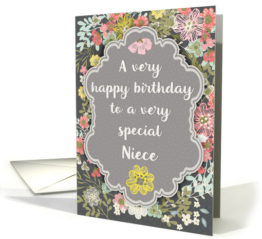Say happy birthday to your niece with this pretty floral arrangement topped with a modern frame and a pair of single flowers.