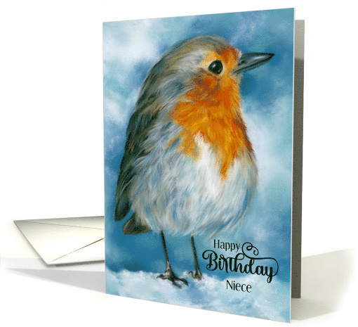 A charming English robin redbreast, illustrated in soft pastel tones of gray, orange, and blue, graces the cover of this birthday card. Perfect for personalizing for your niece or anyone, the bird is shown standing in profile against a snowy backdrop.