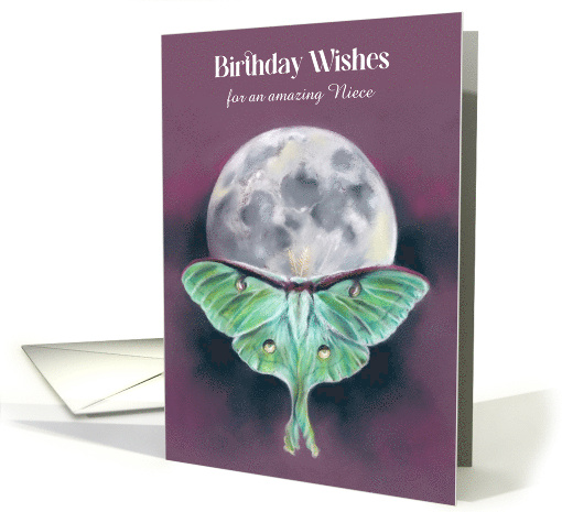 Your niece will appreciate a birthday wish personalized just for her. This card features an enchanting luna moth with green wings set against a deep purple backdrop and the moon in full.