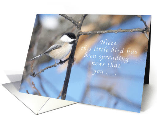 A cute little black caped chickadee spreading news of an upcoming birthday. This card is great for a niece's birthday. There are many symbolic ideas seen in the Chickadee which include courage, curiosity, sharp-witted and being sociable among others.
