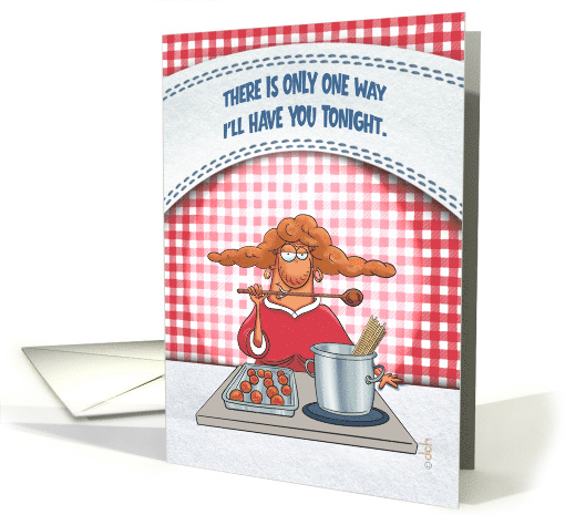 | Artist Notes: | This card has a flirty Aunt Mella biting on a spoon in behind a pot of linguini and tray of meatballs. It has a funny pun for celebrating an anniversary or relationship. She is in red with a red gingham background. The design is cartoon airbrushed style with paper cut-out accents. |