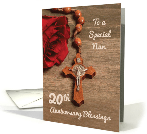 A Nun will be delighted to receive such a beautiful Christian card! She started her Religious profession twenty years ago and now it’s time to celebrate her 20th Ordination Anniversary. A huge red rose with a rosary crucifix made of silver and wood, both on a wooden table. May God reward her for her generous service.