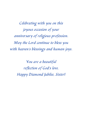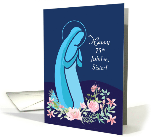 A Catholic nun is celebrating her diamond jubilee in the religious life. Celebrate this special day with her by sending this wonderful 75th anniversary card to let her know that you are blessed and grateful for her. A dark blue background displays Mary, our Blessed Mother, praying surrounded by pink roses.