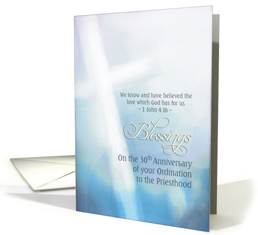 | Artist Notes: | Send stylish "Blessings on the 30th Anniversary of your Ordination to the Priesthood" with this card featuring a white cross on a blue background (watercolor). Scripture text is 1 John 4:16. You can edit text inside card. Custom requests welcome. |