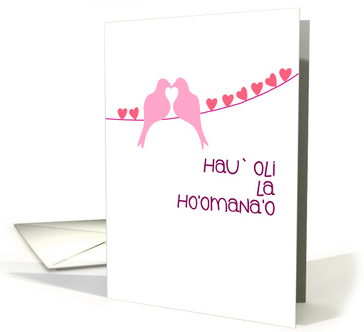 | Artist Notes: | 2 pink turledove silhouettes sitting on a wire with hearts on a white background with the text "Hau`oli la Ho'omana'o" = Happy Anniversary in Hawaiian |