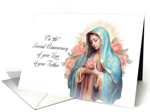 | Artist Notes: | As the second anniversary of a father’s passing approaches, this Catholic card presents the Blessed Virgin Mary gently holding a rose, surrounded by delicate floral imagery. The roses represent purity and remembrance, while Mary’s serene expression offers peace. Thoughtfully designed, this card is a heartfelt way to support someone as they remember their father and continue to hold him in their prayers on this special day of remembrance. |