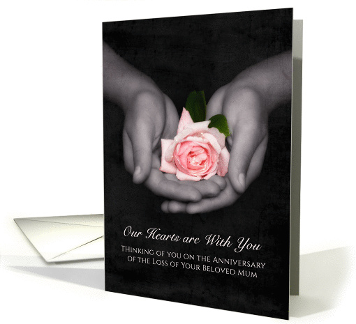 | Artist Notes: | A sentimental memorial anniversary card in remembrance of a cherished mum with a beautiful photograph of a delicate soft pink rose covered in shimmering raindrops in a pair of heart shaped hands. Front text reads: Our hearts are with you. Thinking of you on the anniversary of the loss beloved mum. This beautiful remembrance anniversary card with a faded musical notes against a black background will remind the grieving person of your sympathy as you honor the memory of his or her mum's death |