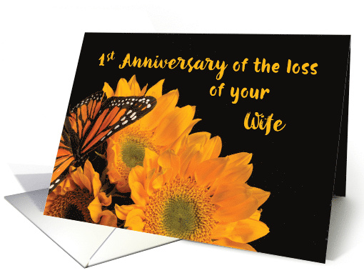| Artist Notes: | Sunflowers and a butterfly is on the cover of this card that you can send to express sympathy and comfort a bereaved husband on the 1st year anniversary of the loss of a dear wife. Let him know that he is thought of. Cover font is intentionally highly textured along the edges as it is a font style with natural brush strokes to create an authentic brush texture. |
