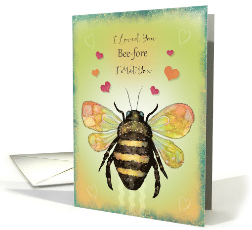 | Artist Notes: | First date anniversary. This cute card with a bee pun states I loved you bee-fore I met you. Colorful painted honey bee with hearts on a colorful green and orange background with hints of blue-green in outer border. Original artwork by the artist. |